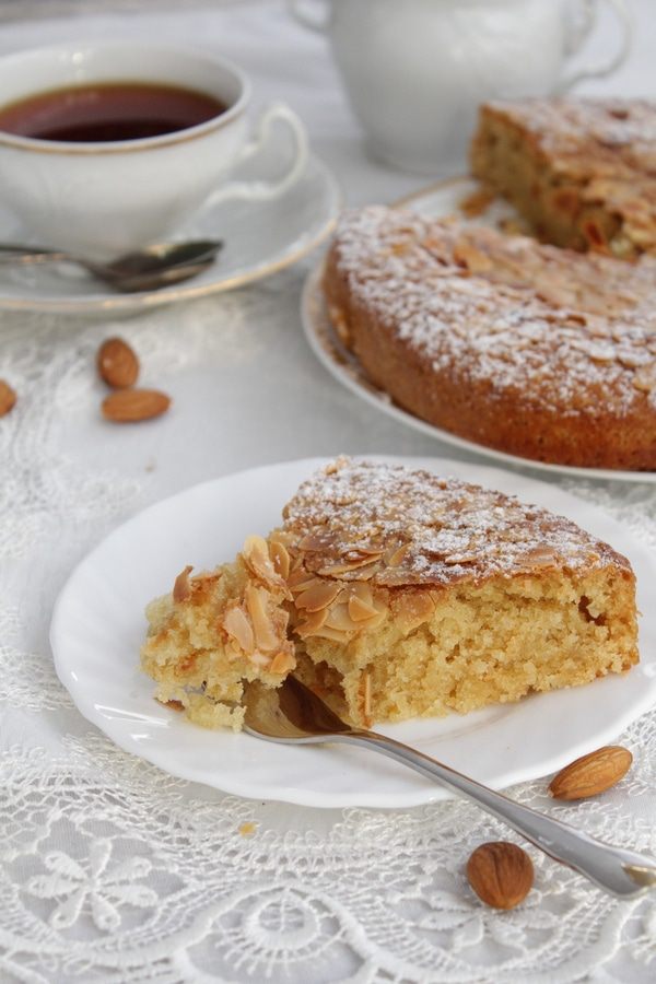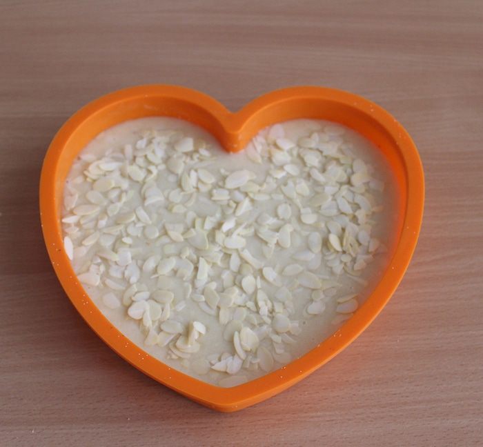 Выложить в форму 15 см, посыпать миндальными лепестками.