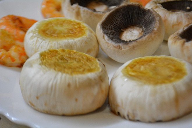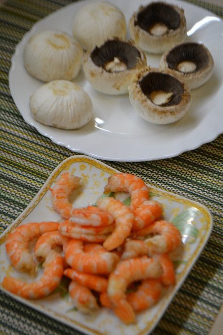 Шампиньоны помыть, обсушить бумажным полотенцем и удалить ножки. Креветки отварить и очистить. В этот раз я их очистила и припустила на сковороде вместе с шампиньонами на оливковом масле до подрумянивания.