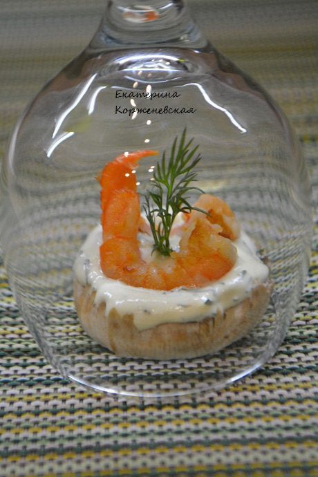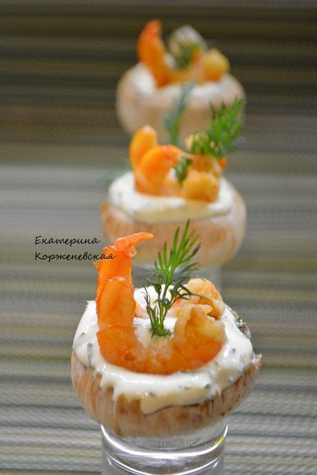 Начинить шляпки соусом и вставить по 2 королевские креветки, украсить зеленью укропа.