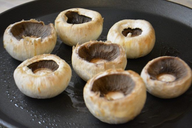 Сковороду накалить, сбрызнуть оливковым маслом и поджарить грибы с одной стороны. Жарить не больше 2 минут, чтобы грибы не пустили сок.