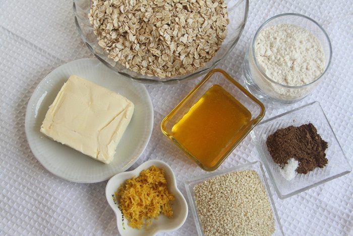 Понадобится 200 г овсяных хлопьев, 100 г муки, 125 г мёда, 125 г сливочного масла, 1 ст. л. молотой корицы, мелко натёртая цедра 2 лимонов, щепотка соли, 50 г кунжута.