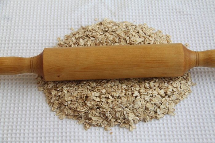 Овсяные хлопья выложить на полотенце и прокатать скалкой. Если используете хлопья быстрого приготовления, думаю, можно этот шаг пропустить.