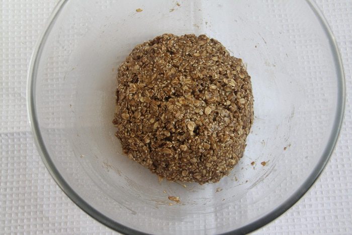 Добавить овсяные хлопья в смесь. Замесить тесто.
