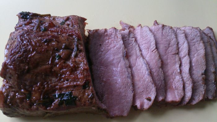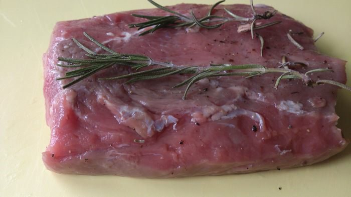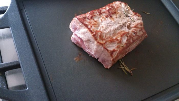 Сковороду хорошо разогреть и обжарить мясо со всех сторон для запечатывания сока и запечь в духовке при 180°С 15 минут.