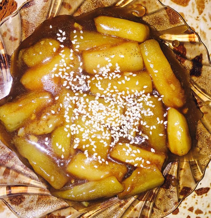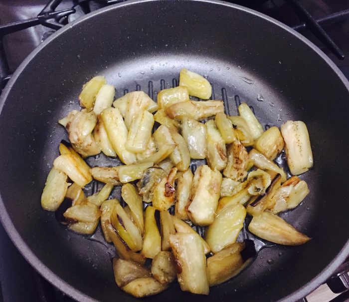В это время, пока будут обжариваться баклажаны, сделаем соус. Воду, соевый соус, уксус, сахар, соль, крахмал и размельченный чеснок смешаем и выливаем в сковороду, ждем минуты 2-3 до загустения соуса. Посыпаем кунжутом (его заранее можно обжарить). Блюдо готово.