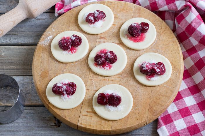 На каждый кружок выложить 2-3 вишенки и немного сахара.