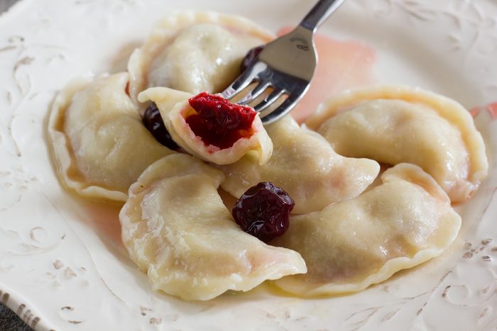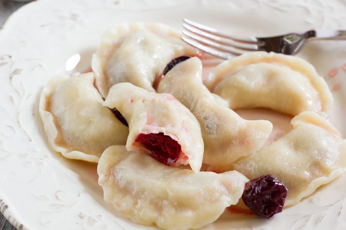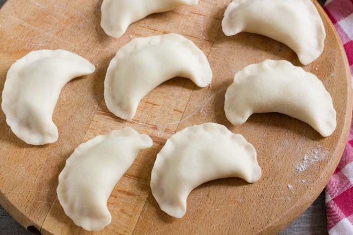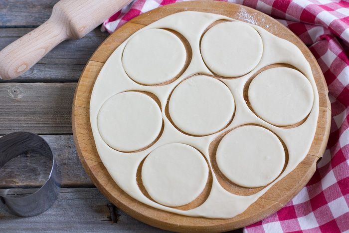 Тесто раскатайте на присыпанной мукой поверхности в пласт толщиной 2 мм. С помощью стакана или круглой кондитерской форму вырежьте кружочки из теста диаметром 6 см.