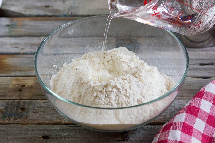 Постепенно вливайте в центр горки воду, затем добавьте масло.