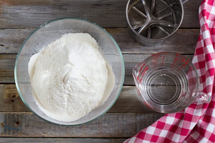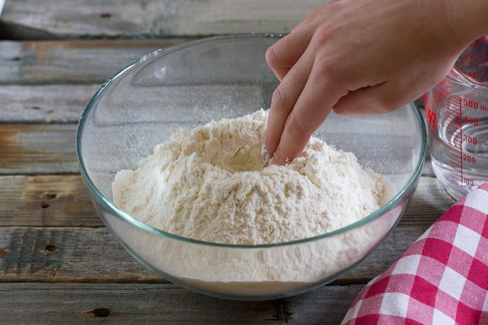 Муку с солью просейте горкой в миску.