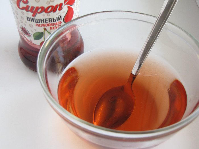 Вишневый сироп развести в воде и пропитать им коржи. Сладость пропитки можно регулировать по вкусу.