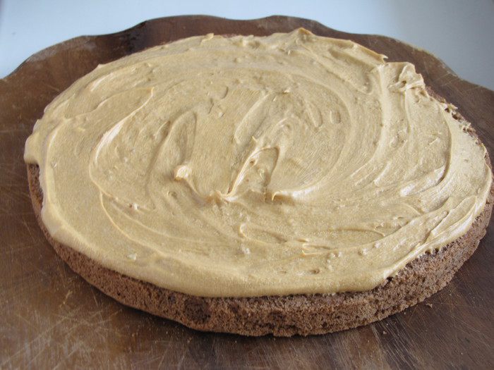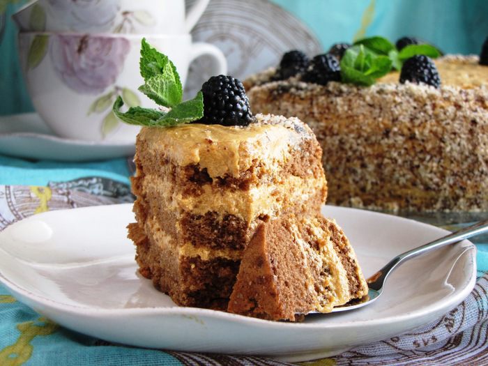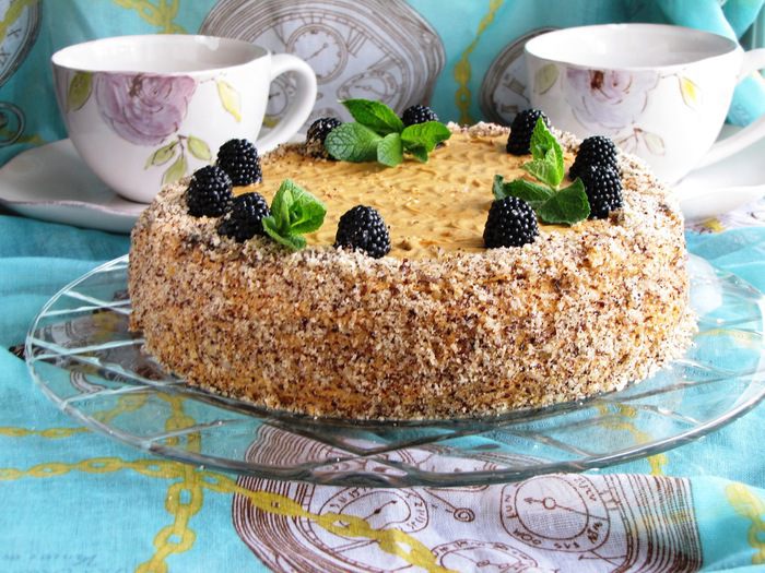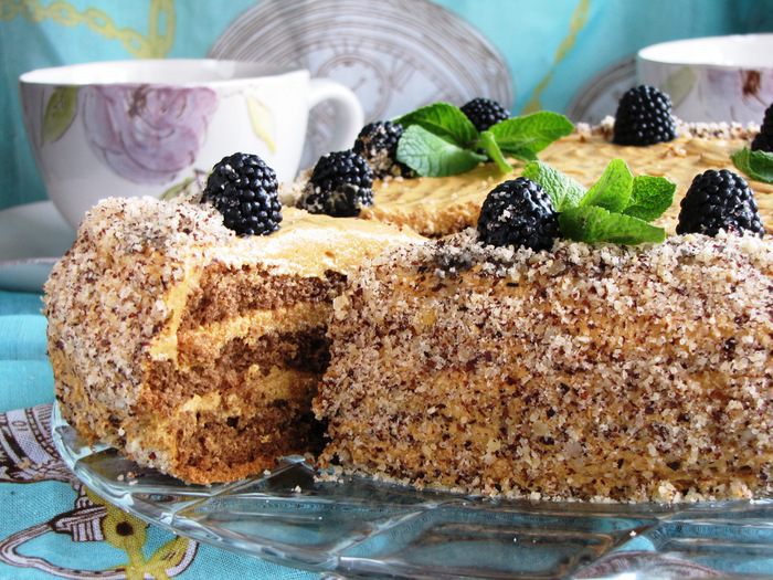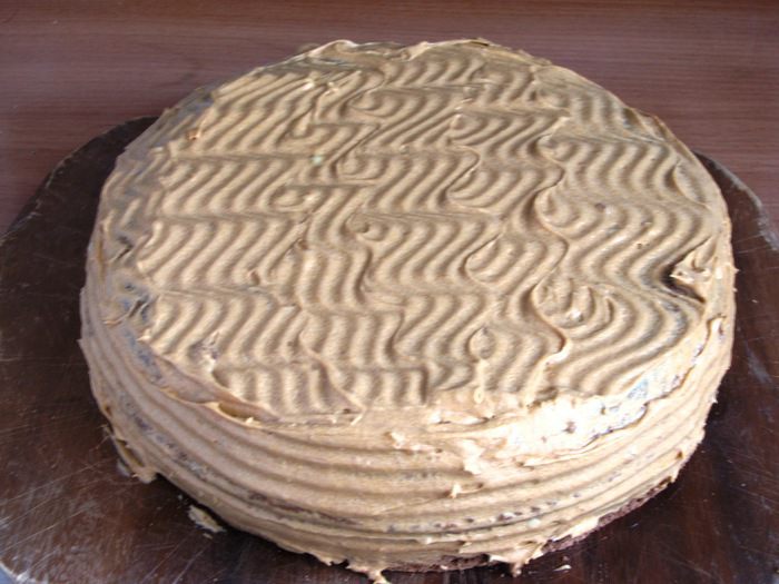 Так же поступить с остальными коржами. Рассчитывать так, чтобы крема хватило и на бока торта. В таком виде торт убрать в холодильник на несколько часов для настаивания.