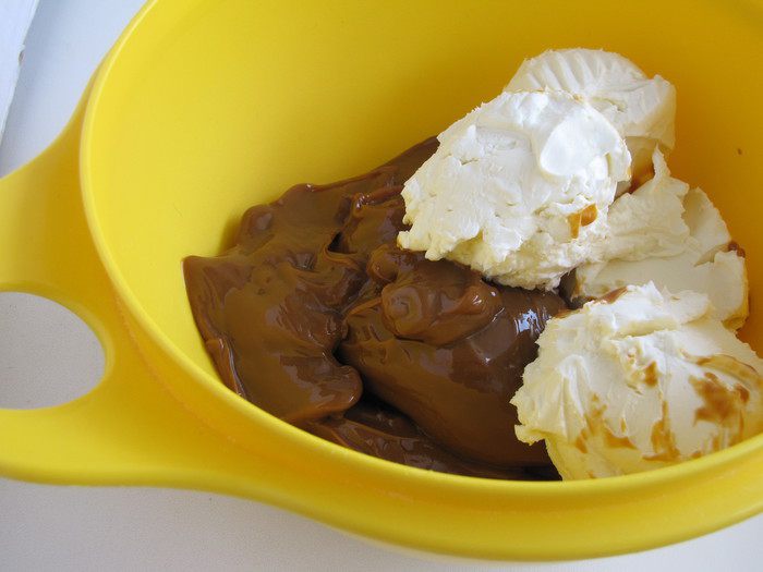 Смешать в миске вареную сгущенку, сливочный сыр и сливочное масло комнатной температуры.