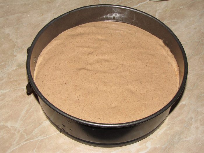 Форму диаметром 20 см, застелить пекарской бумагой, вырезав по форме круг. Смазать бумагу сливочным маслом, бортики смазывать не нужно. Вылить тесто. Немного прокрутить форму вокруг своей оси, чтобы тесто легло ровнее.