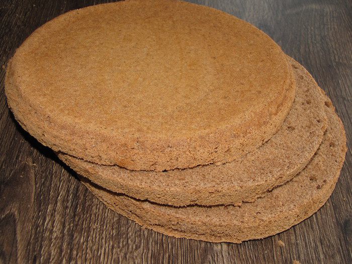 Бисквит разрезать на три одинаковых коржа. Я обычно это делаю при помощи шелковой нити.