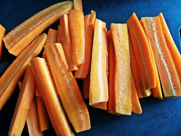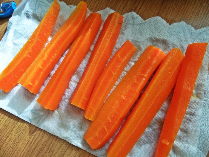 У меня три крупные морковки. Чистим, моем. Делим пополам.