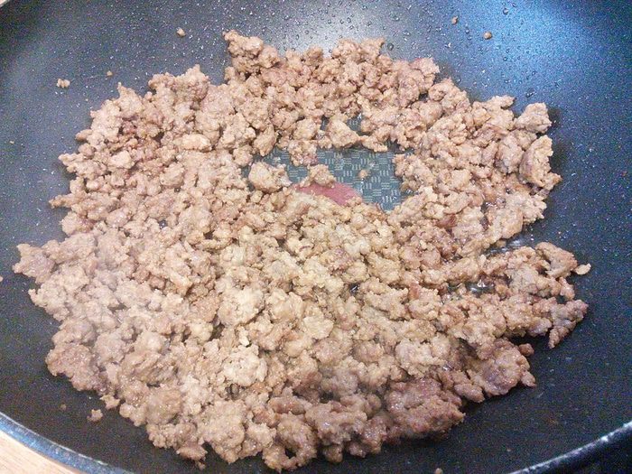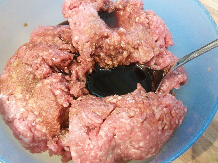 У меня фарш свиной с говяжим 50:50. Фарш смешать с соевым соусом и солью и оставить на 10 минут мариноваться.