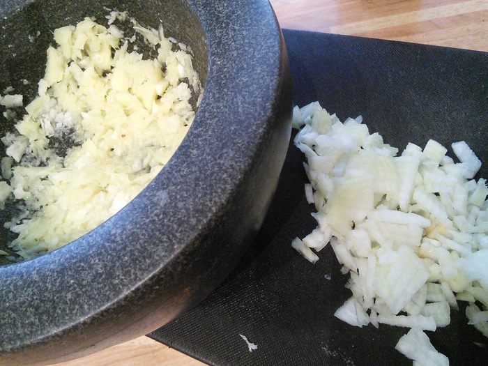Чеснок и имбирь растереть в кашицу. Зеленый лук нарезать кольцами (у меня зеленого лука не оказалось, поэтому я добавила репчатый и обжарила его в начале).