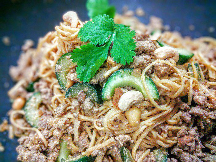 Сковородку (в идеале вок) раскалить, добавить 3 ст. л. арахисового масла и обжарить фарш до легкого золотистого цвета. Переложить в тарелку, отставить в сторону.