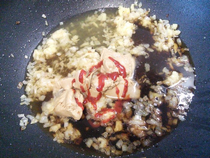 В этой же сковороде обжарить, добавив оставшееся масло, чеснок и имбирь, добавить зелёный лук. Обжарить и быстро добавить пасту тахини, томат и бульон. Довести до кипения и тушить на малом огне 5 мин.