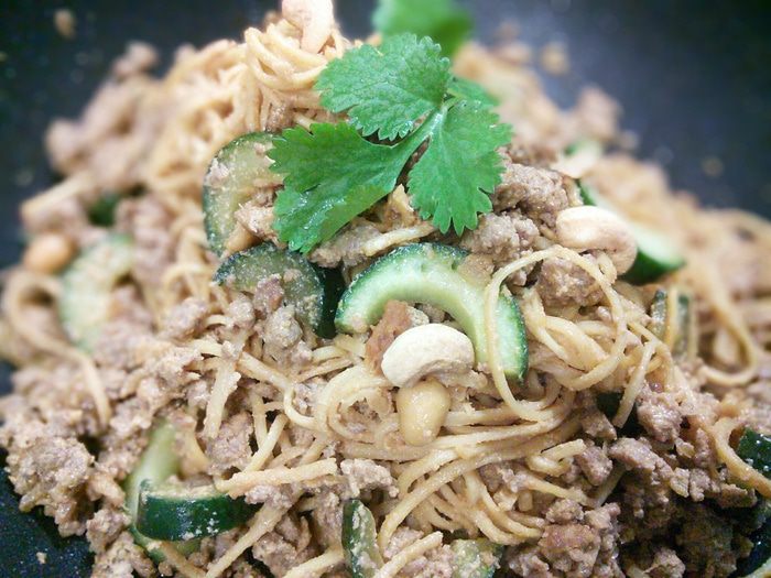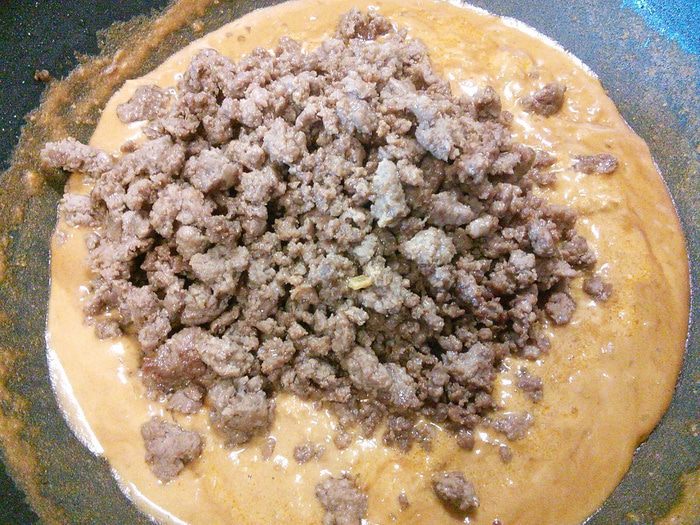 В соус добавить фарш, размешать и тушить до загустения соуса. Тем временем сварить лапшу (у меня китайская лапша), слить воду.