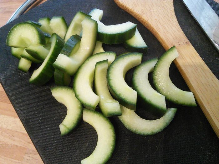 Вмешать лапшу в соус. Огурец порезать вдоль на две половины, вынуть семена и нарезать на шайбы.