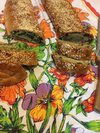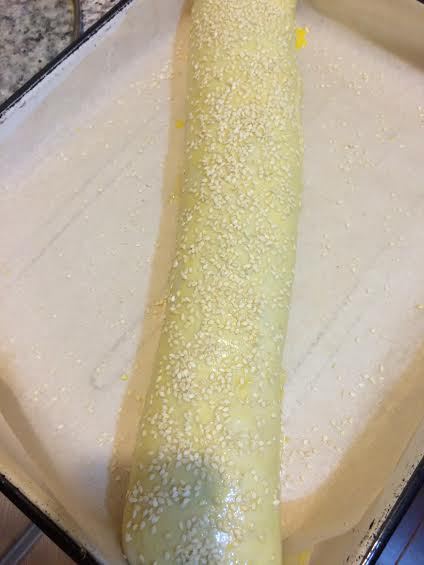 Смешать 1 желток, 2 ст.л молока и смазать рулет. Присыпать кунжутом. Выпекать в заранее разогретой духовке до 200°C 40-50 минут.