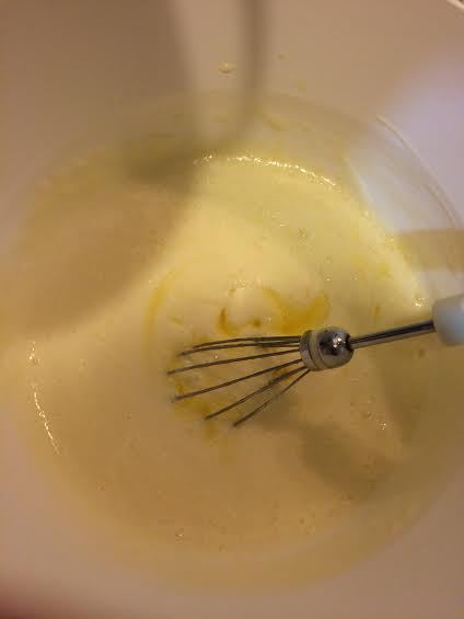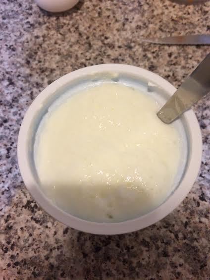 В миске смешать мацони с яйцом, солью и сахаром. Добавить сливочное масло и перемешать.