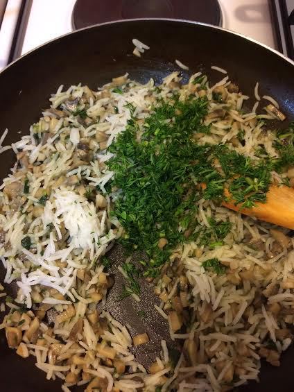 Потушить лук с грибами, минут 10 (грибы должны отдать воду, чтоб начинка не получилась слишком влажной), добавить рис, укроп, соль, перец и перемешать. Дать слегка остыть.