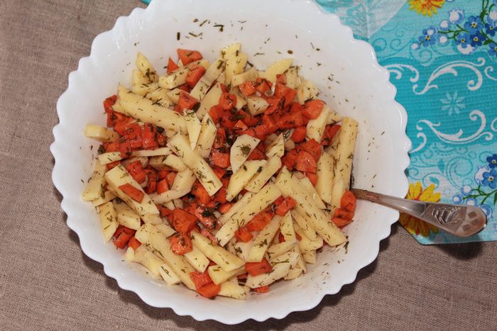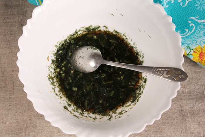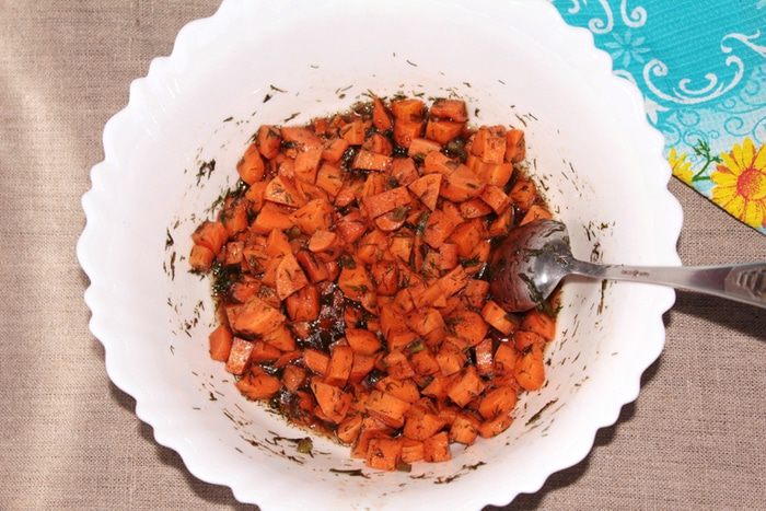 Приготовить маринад в такой емкости, чтобы была возможность соединить его с овощами. Для маринада смешать гранатовый и соевый соусы, кленовый сироп (его можно взять меньше или больше, учитывая сладость моркови), молотый кориандр и сушеный базилик, подсолнечное масло и укроп (свежий или свежезамороженный).