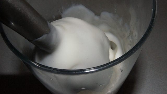 Продолжая взбивать добавить растительное масло тонкой струйкой. Смесь начинает густеть на глазах. Взбиваем около минуты.