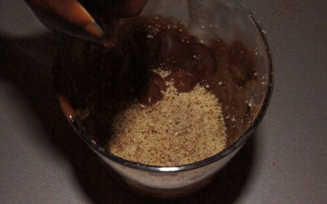 Добавить измельченные в мелкую крошку орехи и перемешать (можно пробить еще раз блендером).
