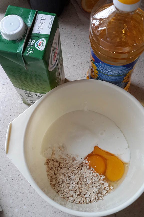 Хлопья смешать с творогом, яйцами, маслом и густым (!) кефиром.