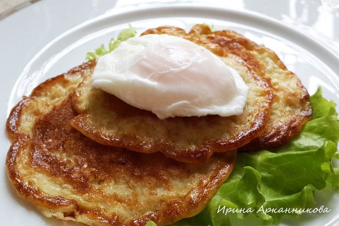 На оладьи выкладываем яйцо. У В. Пискунова оладьи еще поливаются растопленным сливочным маслом. Но те кто, как я, на правильном питании в данный момент, прекрасно обойдутся без масла. Оладьи и так масляные, очень нежные.