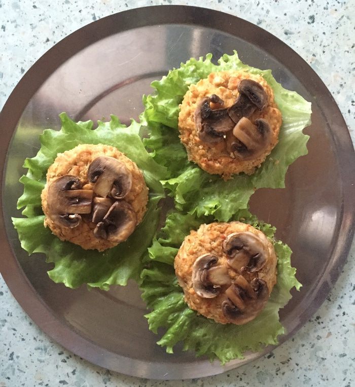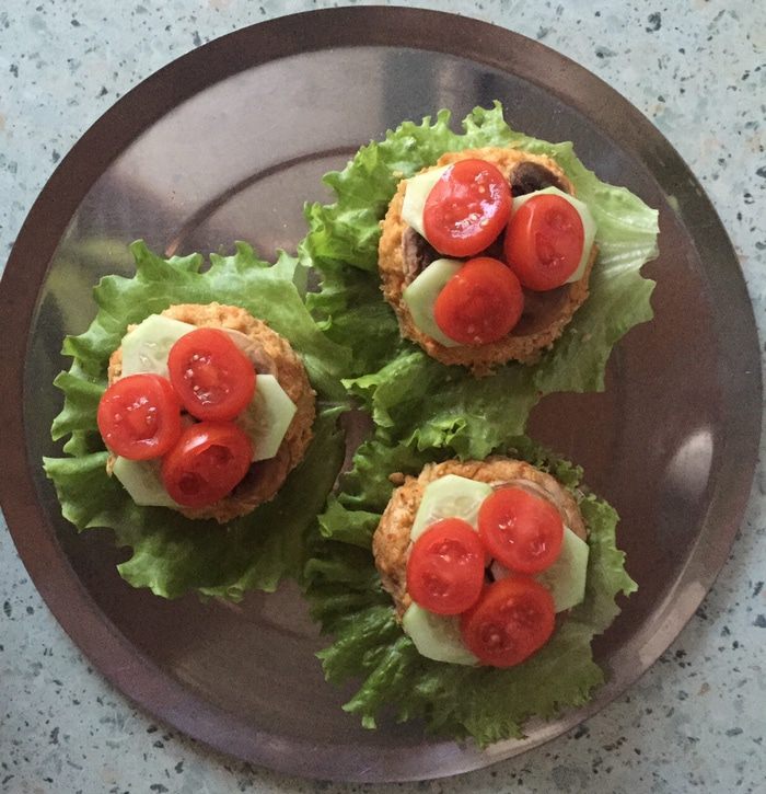 Из теста лепим 5 котлет по форме и размеру ваших хлебцев, хорошо утрамбовываем их и помещаем на противень на пергамент для выпечки. По желанию можно предварительно смазать пергамент оливковым маслом. Помещаем противень с котлетами в духовку и оставляем выпекаться в течение 30 мин.