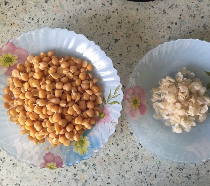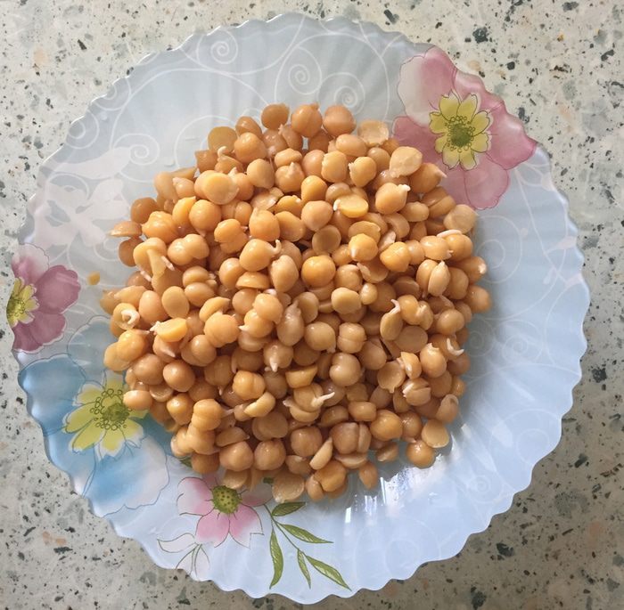 Начнем с подготовки нута. 100 г нута замочить на ночь в воде комнатной температуры в пропорции 1:3. Утром воду слить, поместить нут в кастрюлю, залить холодной водой и довести до кипения на сильном огне. Затем огонь уменьшить до среднего и оставить нут вариться 1 час, при необходимости снимая пену. Из 100 г сухого продукта получится примерно в 2 раза больше вареного нута — этого количества хватит на 5 котлет.