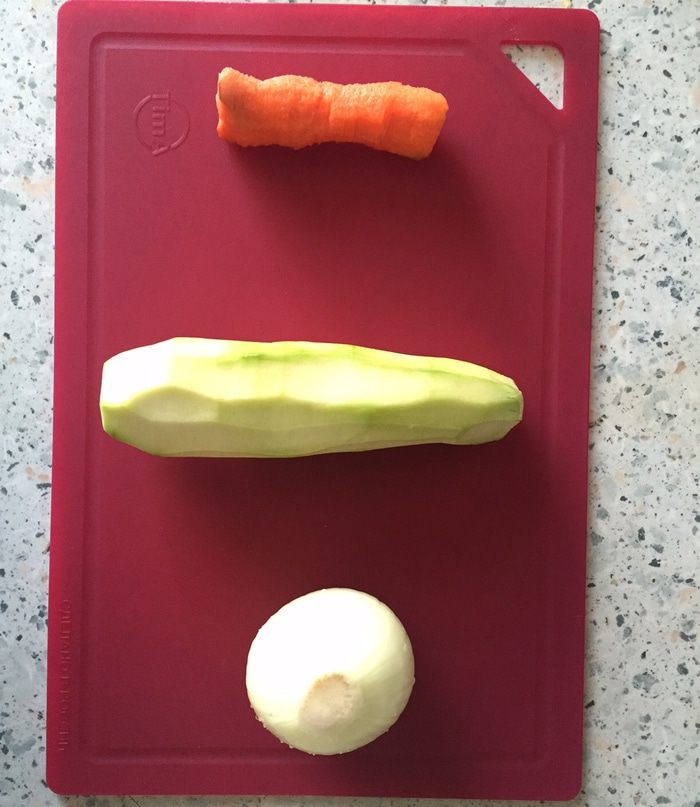 Подготовим овощи для котлет: помоем и почистим одну небольшую морковку, один средний цукини и небольшую луковицу.