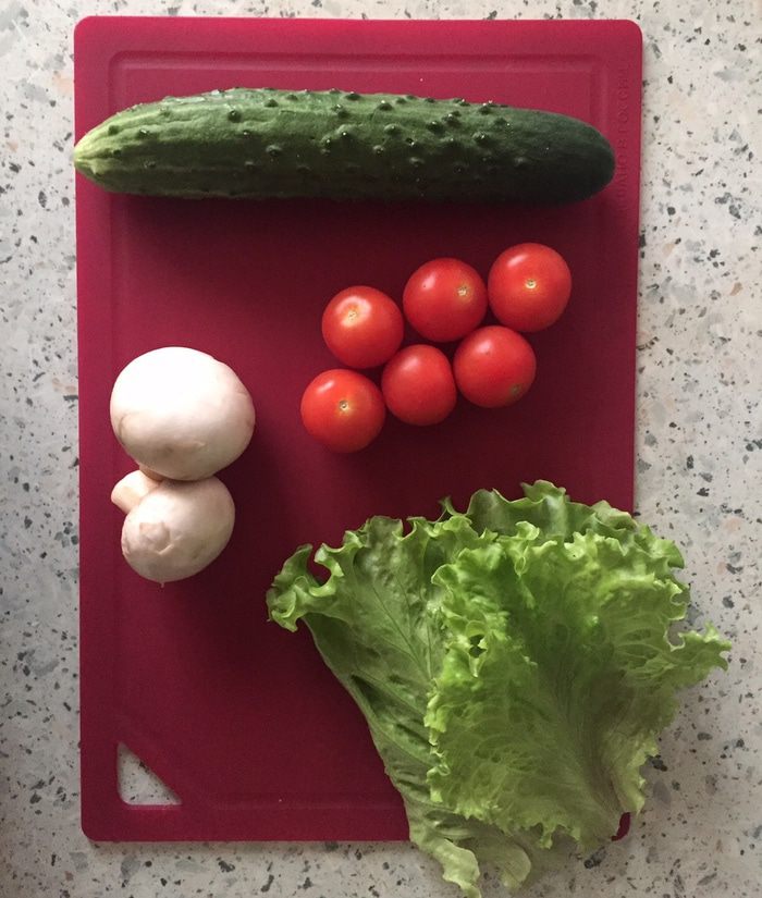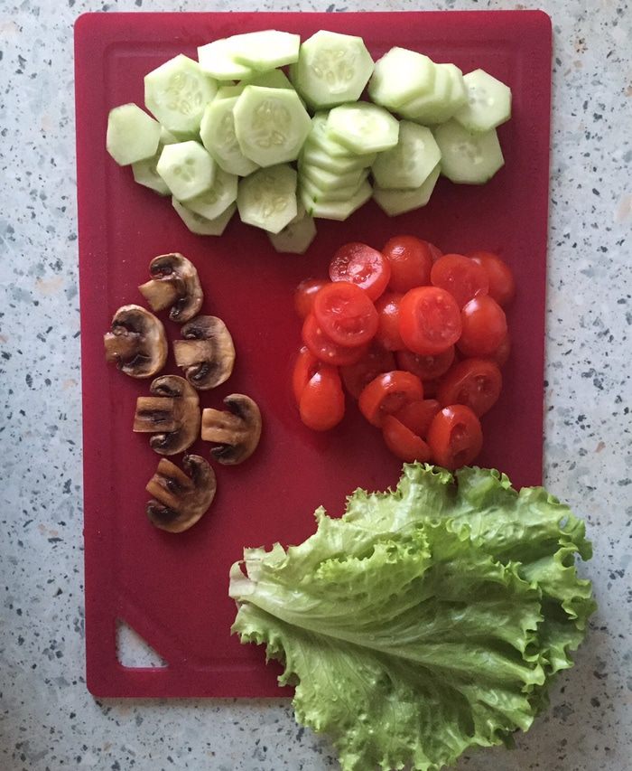 Огурец очищаем от кожуры и режем тонкими ломтиками, черри нарезаем на тонкие половинки или четвертинки, листья салата обмываем и обсушиваем на бумажном полотенце.