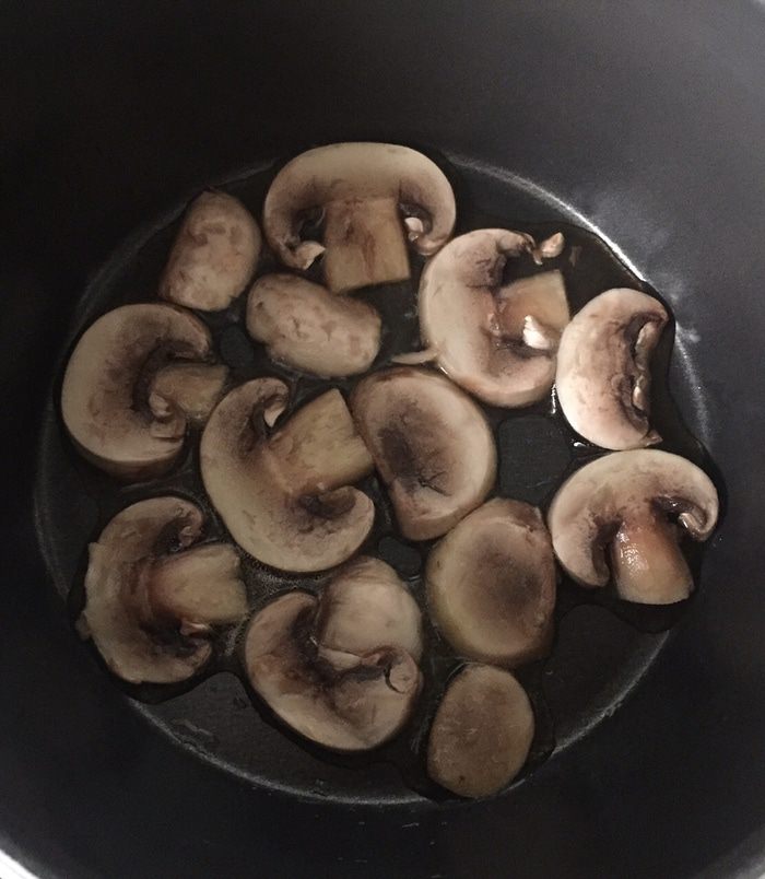 Шампиньоны промываем, обрезаем низ ножки, режем на тонкие слайсы и обжариваем в сотейнике на оливковом масле с обеих сторон на среднем огне. В конце обжарки прибавляем огонь, чтобы грибы покрылись красивым румянцем.
