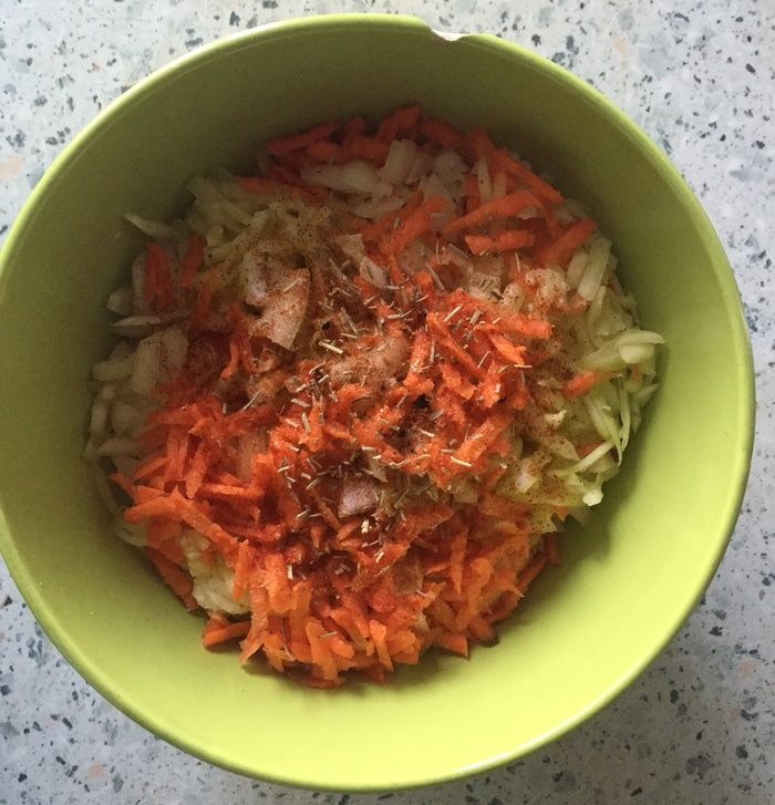 Перетертый нут и нарезанные овощи соединяем в миске, добавляем 2 столовые ложки соевого соуса, выжимаем в миску сок половины лимона и добавляем все специи. Если у вас насыщенный соевый соус, то соль дополнительно можно не добавлять.