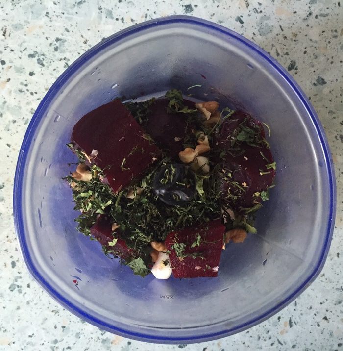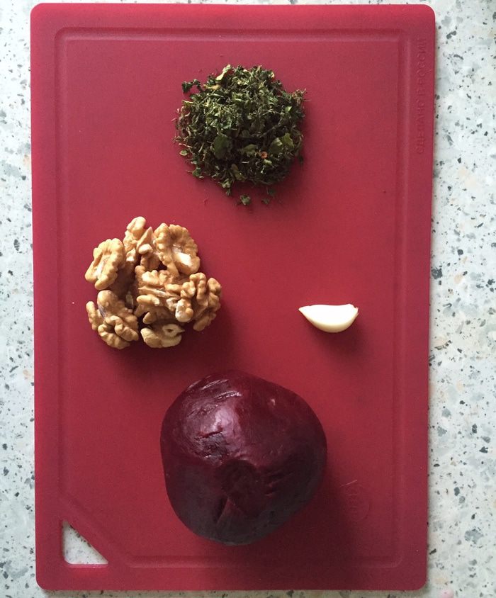 Готовим свекольный соус для хлебцев. Свеклу отвариваем в течение 20 мин, даем остыть, чистим от кожуры и режем крупными кусками, мелко нарезаем пучок укропа, грецкие орехи ломаем на куски, а зубчик чеснока разрезаем на четвертинки.