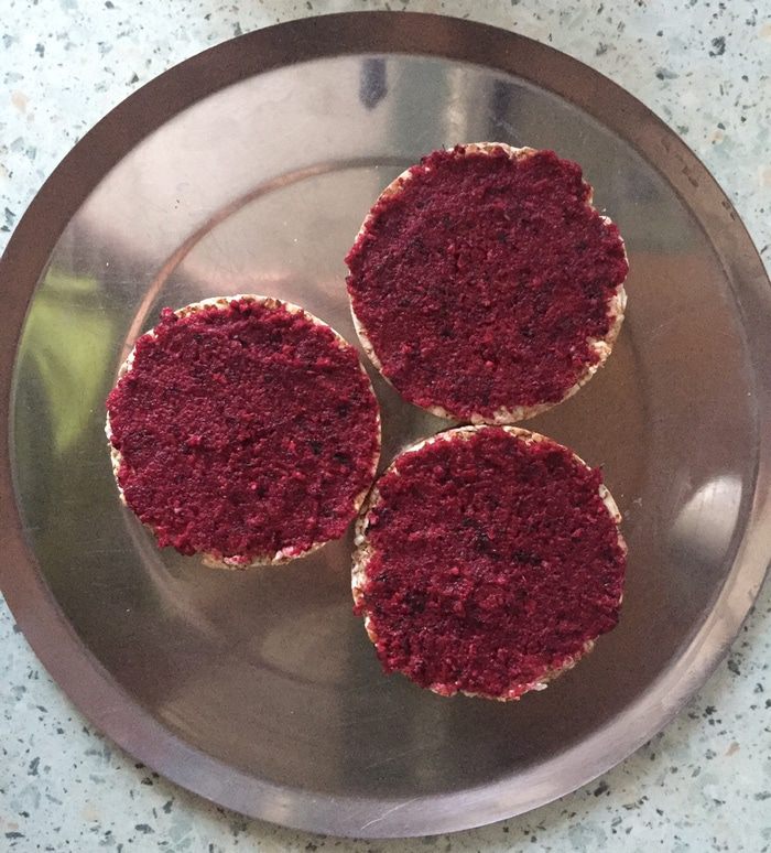 Смазываем каждый хлебец свекольным соусом, используем на этом этапе половину соуса.