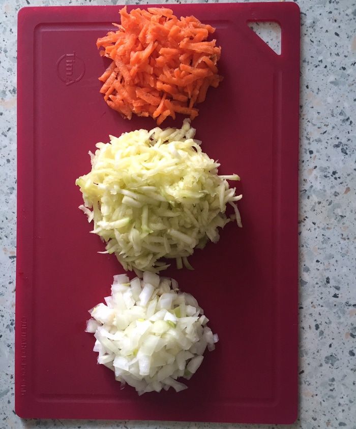 Цукини и морковь трем на средней терке, а луковицу мелко режем.