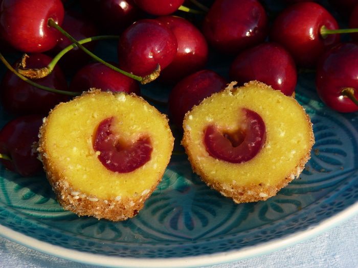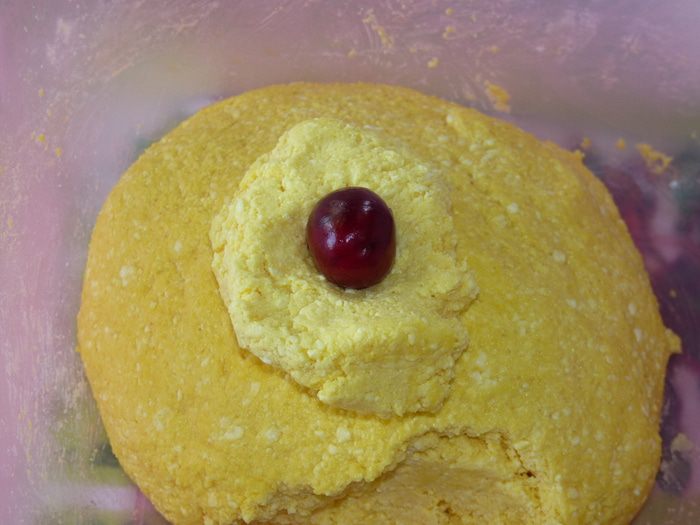 Из теста делаем лепешки, в центр каждой кладем черешню, аккуратно соединяем края. Из указанных продуктов получается около 24 шт, в зависимости от размера. Если делать без начинки и меньше размер, то выходит гораздо больше.
