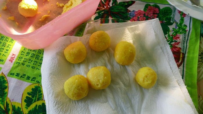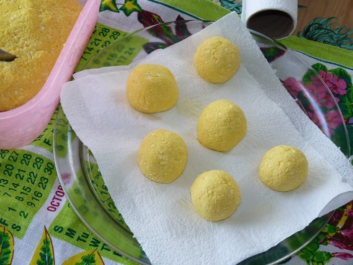 Опускаем шары в кипящую воду и аккуратно поддеваем их ложкой со дна, чтобы не пристали ко дну и друг к другу. Проварить до всплывания, затем еще пару минут (главное не переварить!). Выложить на бумажное полотенце.