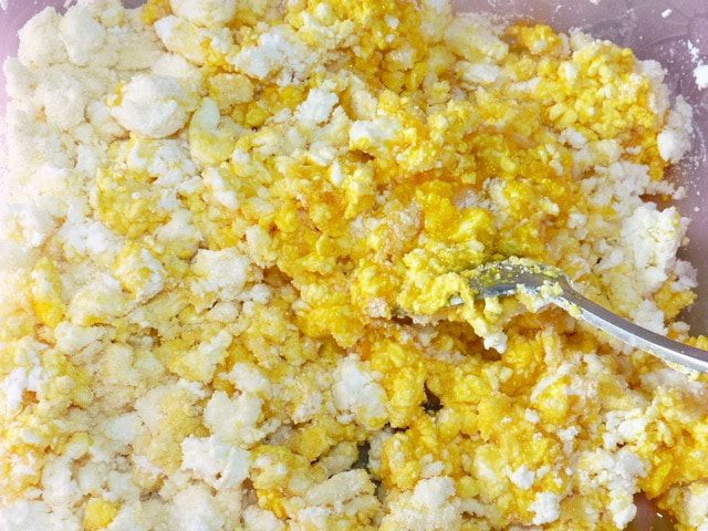 Творог смешать с желтками, ванильным сахаром, сахарной пудрой, крахмалом, щепоткой соли и манкой. Перетереть ложкой до однородной массы (творог я брала жирный, домашний), тесто получается нежное, бархатное на ощупь.