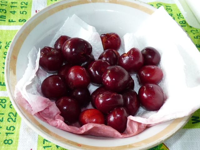 Тем временем очистить черешню от косточек. Выложить на бумажное полотенце, чтобы убрать лишнюю жидкость.