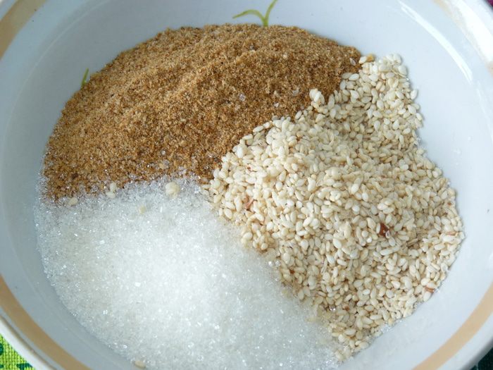 Панировочные сухари поджарить на сухой сковороде до золотистого цвета. Остудить. Добавить сахар и кунжут. Перемешать.