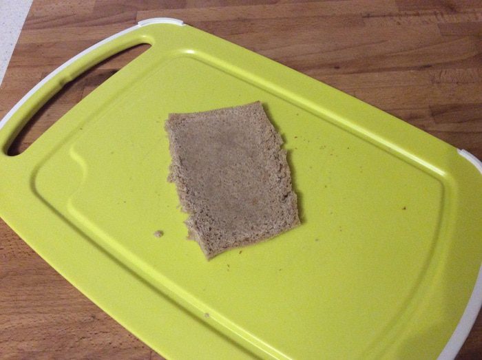 Берем кусочек вашего любимого хлеба, обрезаем ему края и раскатываем как можно тоньше.