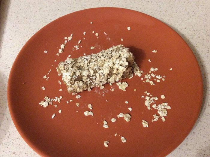 Хлеб аккуратно сворачиваем в рулет, обмакиваем во взбитое яйцо и обваливаем в овсяных хлопьях (у меня быстрого приготовления).
