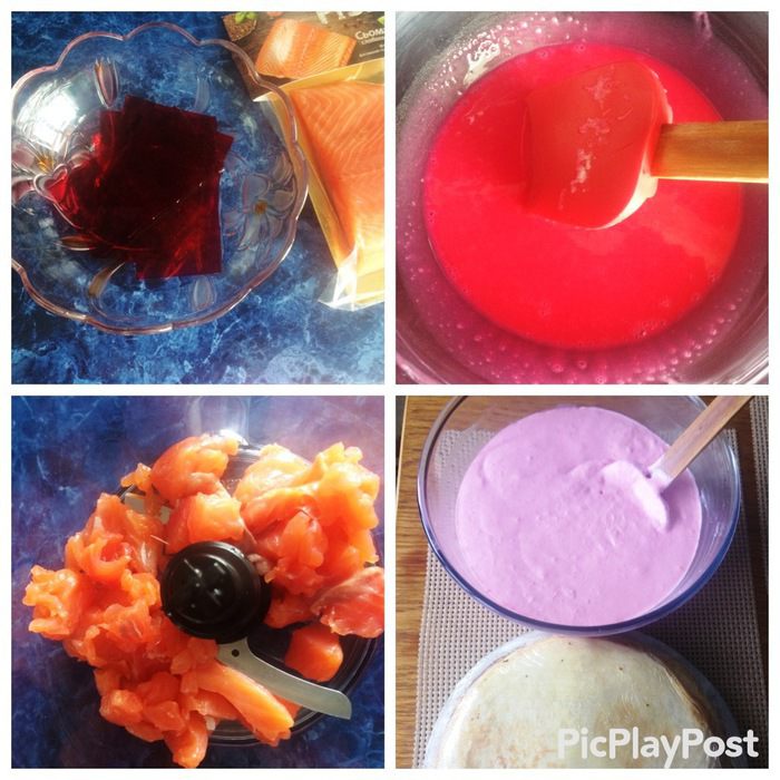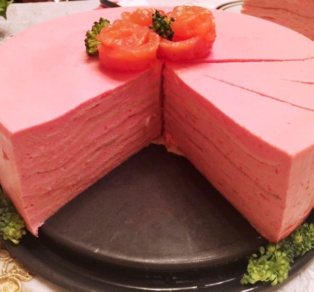 Рыбу (у меня слабосоленая семга) очищаем от кожи, режем на кусочки. Я оставила три тонкие пластины для украшения.